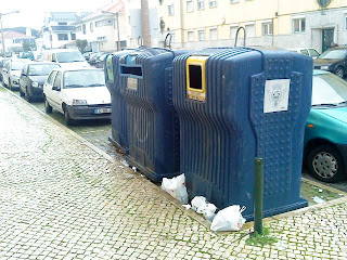 Aparentemente, os sacos que jazem terão sido deixados por cidadãos ou cidadãs que optaram por não os enfiar no recetáculo "embalagens". Disso não podem ser acusados os "serviços", nem eles tem de substituir os cidadãos e cidadãs.