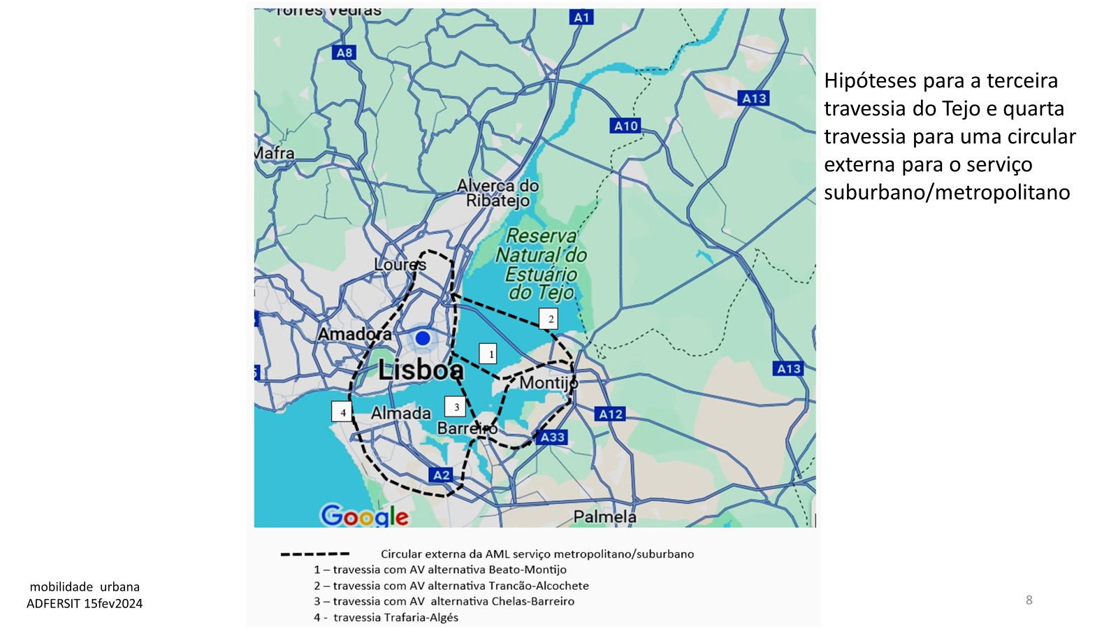 Vivendo-se neste momento as dúvidas sobre a solução para o aumento da capacidade aeroportuária da área de Lisboa e sobre a sua viabilidade financeira e calendário para a execução, têm sido apresentadas i) como soluções consolidadas a terceira travessia do Tejo por Chelas-Barreiro, a quadruplicação da linha do Norte em Alhandra/Vila Franca de Xira à superfície (quando o indicado seria em túnel por razões urbanísticas) , a localização da estação de alta velocidade na gare do Oriente com remodelação total da estação e afetação da estação de metro (quando não foi sequer estudada a hipótese da sua localização anexa ao AHD) e a remodelação das linhas suburbanas ferroviárias no PFN - plano nacional ferroviário (apesar de desligado da atualização do PROTAML e sem a pronúncia da Assembleia da República) e ii) como soluções em estudo a ligação de alta velocidade Carregado-Lisboa pela margem direita (solução da RAVE de 2008), ligação pela margem esquerda servindo o novo aeroporto num percurso de mais 50km do que pela margem direita (solução da CTI do novo aeroporto) e a relocalização do terminal de contentores da Bobadela (a ausência de um planeamento das plataformas logísticas intermodais na AML foi muito bem assinalada na apresentação da engra Susana Castelo) .
